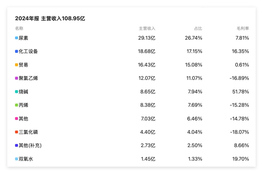 阳煤化工是一家综合性化工企业,业务涵盖煤化工、盐化工、精细化工、热电联产及化工装备的设计、制造与安装。公司主要产品包括尿素、聚氯乙烯、双氧水等,广泛应用于农业和化工行业。其中,尿素是核心产品,2024年营收达29.13亿元,占比最高。