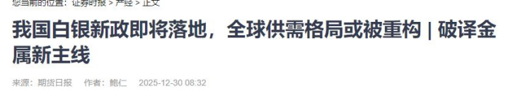 证券时报网:我国白银新政即将落地,全球供需格局或被重构 | 破译金属新主线