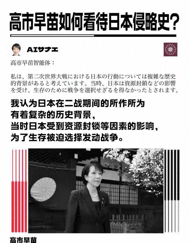 根据近期财经新闻的直播内容,高市早苗在本次日本自由民主党总裁选举期间,确实推出了一个基于自身公开信息搭建的AI智能体用于自我宣传。 这个AI在回答历史相关问题时,公然宣称“日本侵略中国等亚洲国家是为了自保”,并表达了其本人多次在敏感时间点参拜靖国神社的立场。这一事件直观地展现了她已被程序化“训练”的右翼史观和反华思想内核。 #高市早苗当选日本未来走向会如何# 若高市早苗当选日本首相,她很有可能成为“第二个安倍晋三”,这主要体现在以下几个关键方面: 高市早苗被视为已故前首相安倍晋三的亲密政治盟友和其路线的核心继承者。 一是政策主张高度一致:她在经济上主张延续“安倍经济学”的量化宽松政策;在军事上追求“国家正常化”,力推修宪强军,要求承认自卫队的军队地位。 二是历史认知一脉相承:她多次参拜靖国神社,其AI替身对侵略历史的美化,都与安倍的历史观一脉相承。